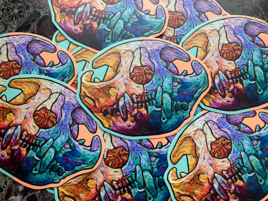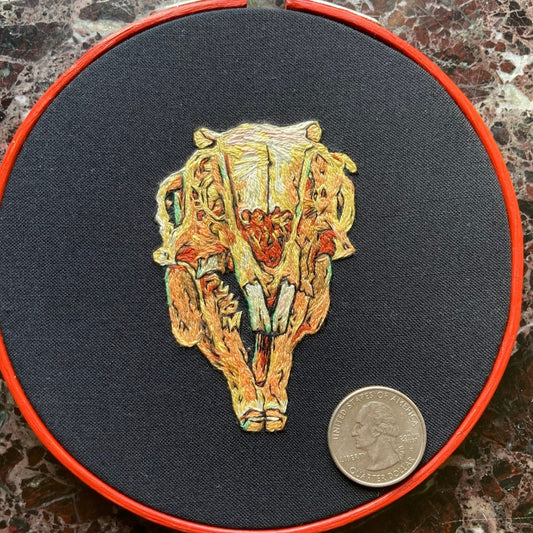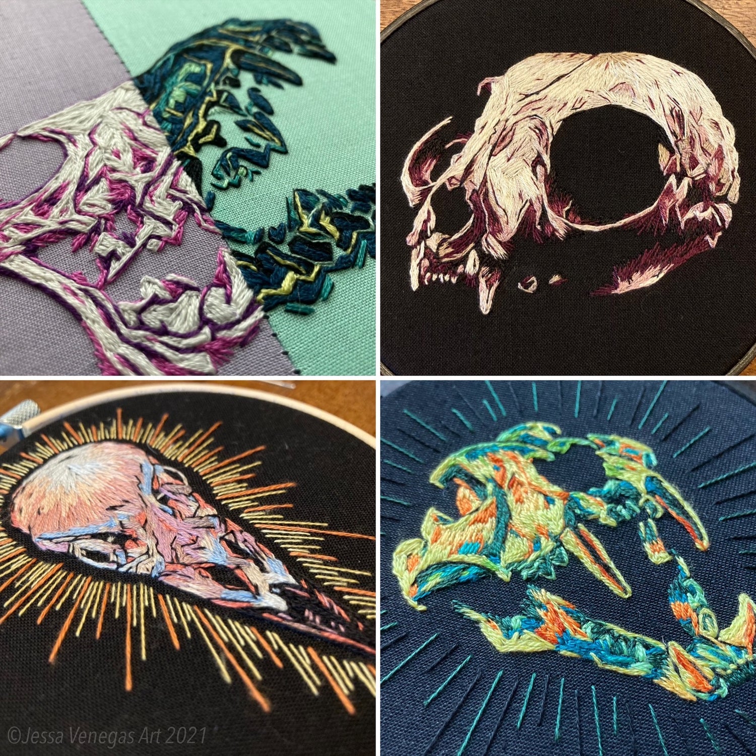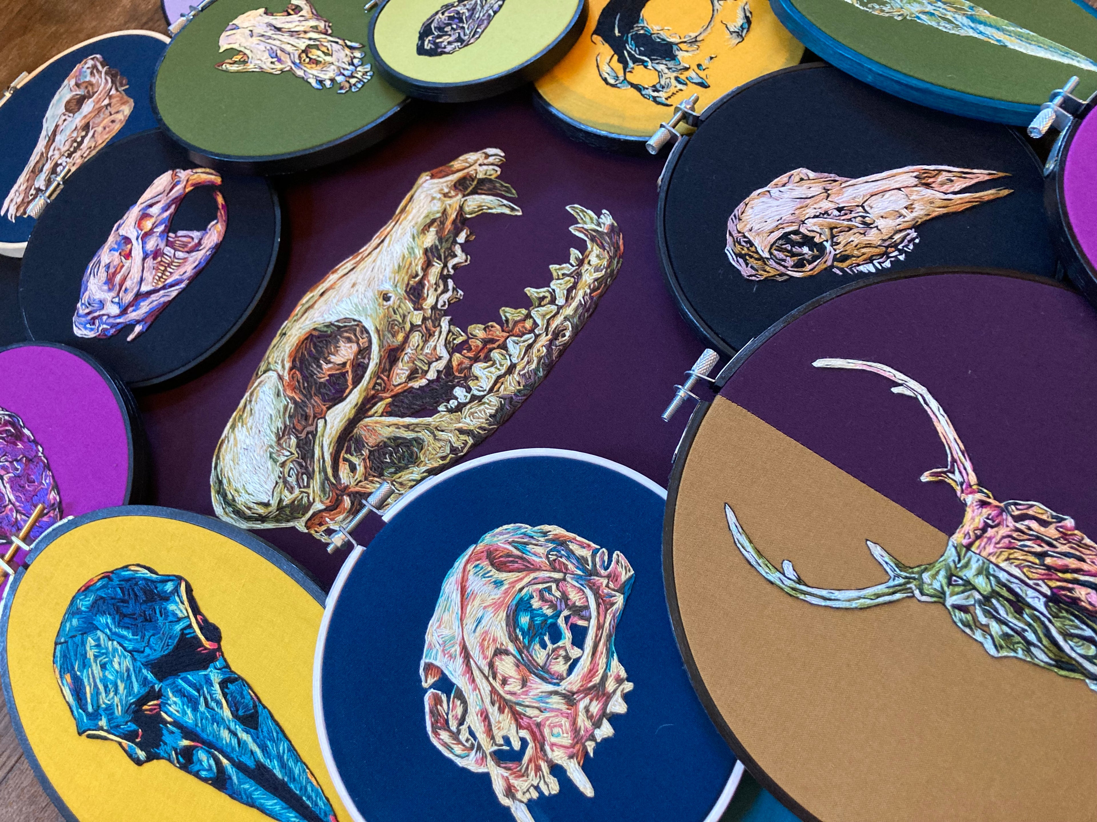 Colorful and quirky animal skulls designed and stitched by Jessa Venegas