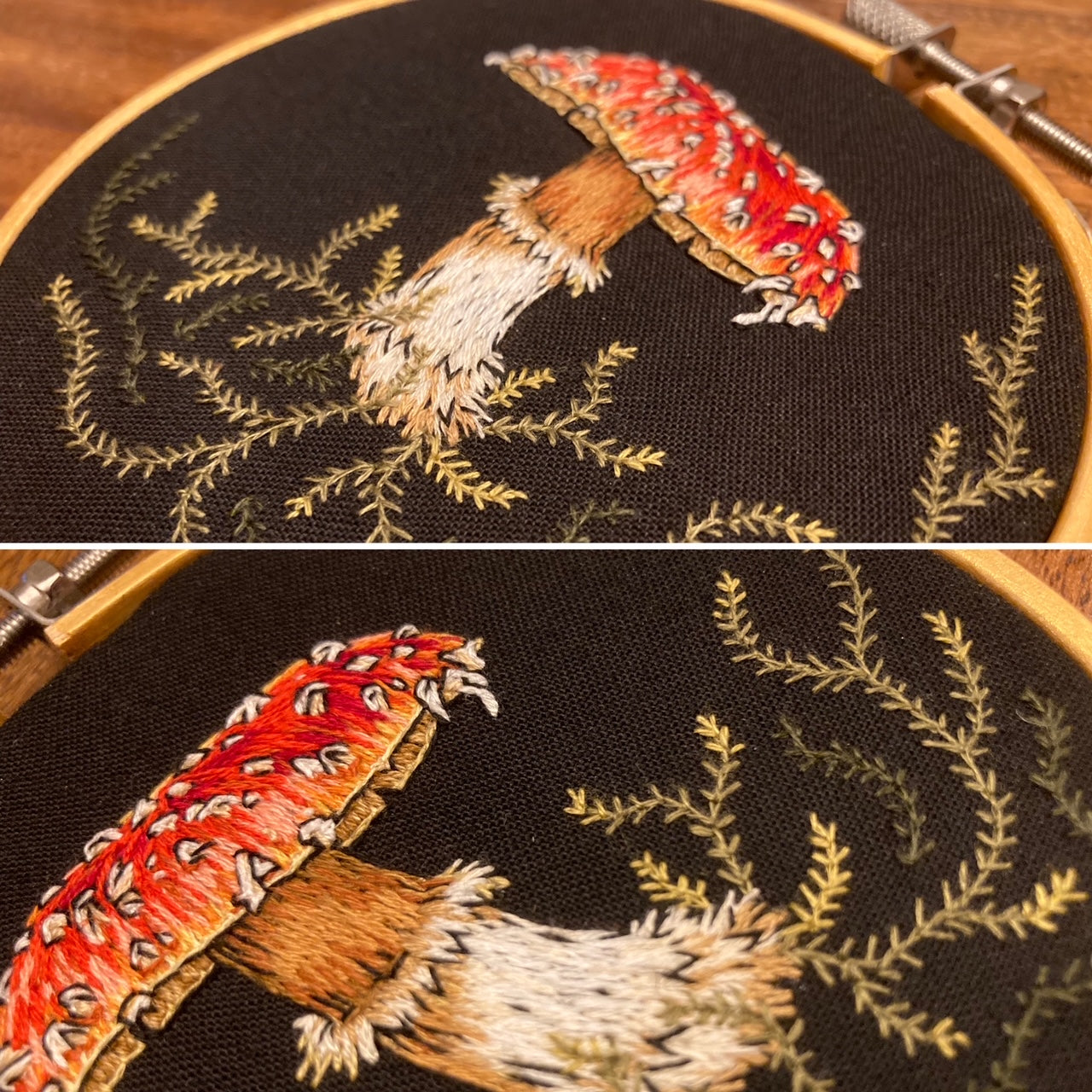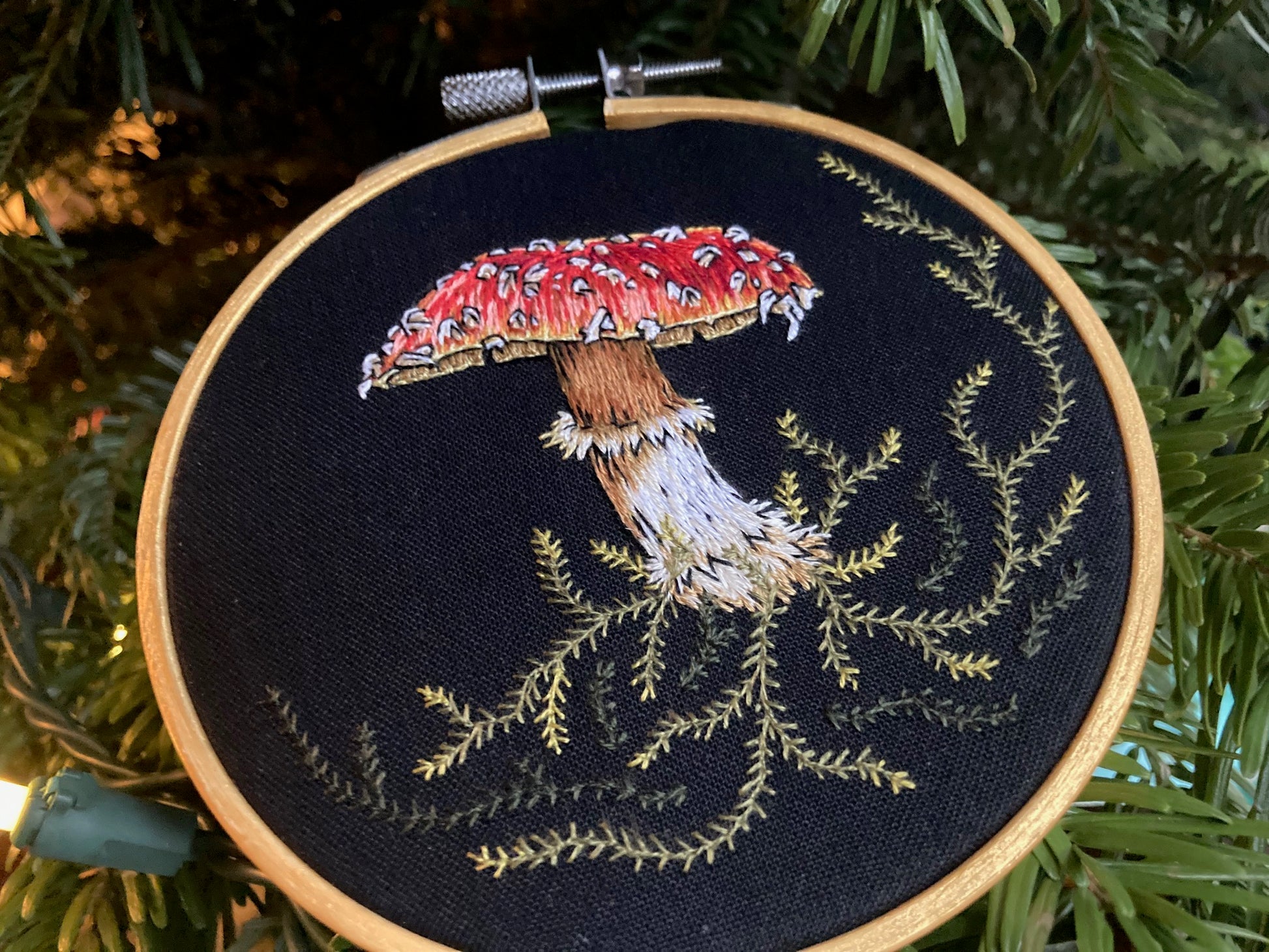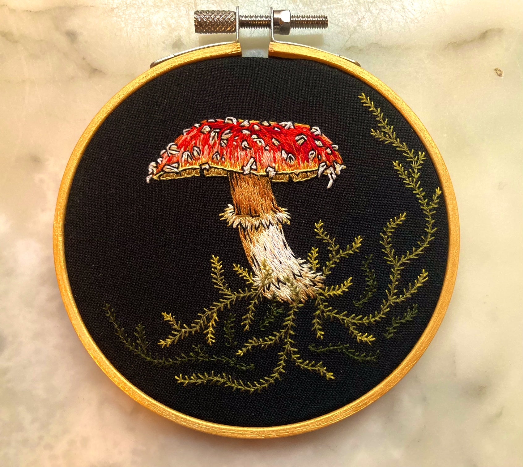 This original Fly Amanita (amanita muscaria) mushroom was stitched in December 2022 in a hand embroidery technique called "threadpainting". It's the only one of its kind.