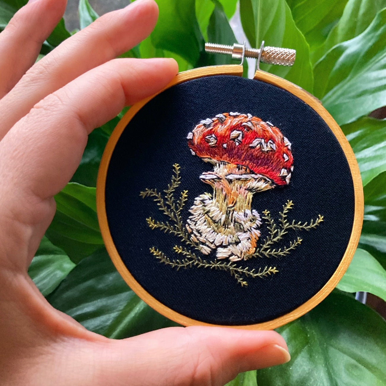This original Amanita mushroom was stitched in January 2023 in a hand embroidery technique called "threadpainting".