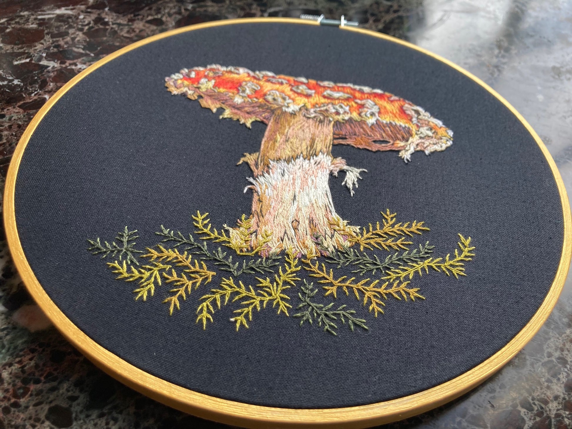 This original Fly Amanita (amanita muscaria) mushroom was stitched in January 2023 in a hand embroidery technique called "threadpainting". It's the only one of its kind, and the largest in the Amanita Mushroom collection.