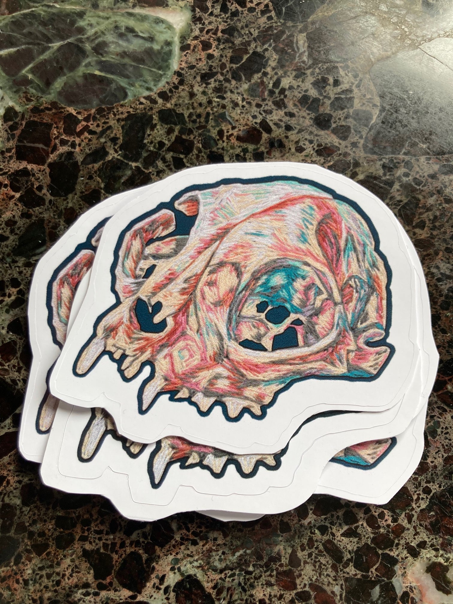One high-quality die-cut large sticker (3") of an anatomical skull of a domestic cat. I stitched this piece in 2020; the original embroidery has now found its forever home.