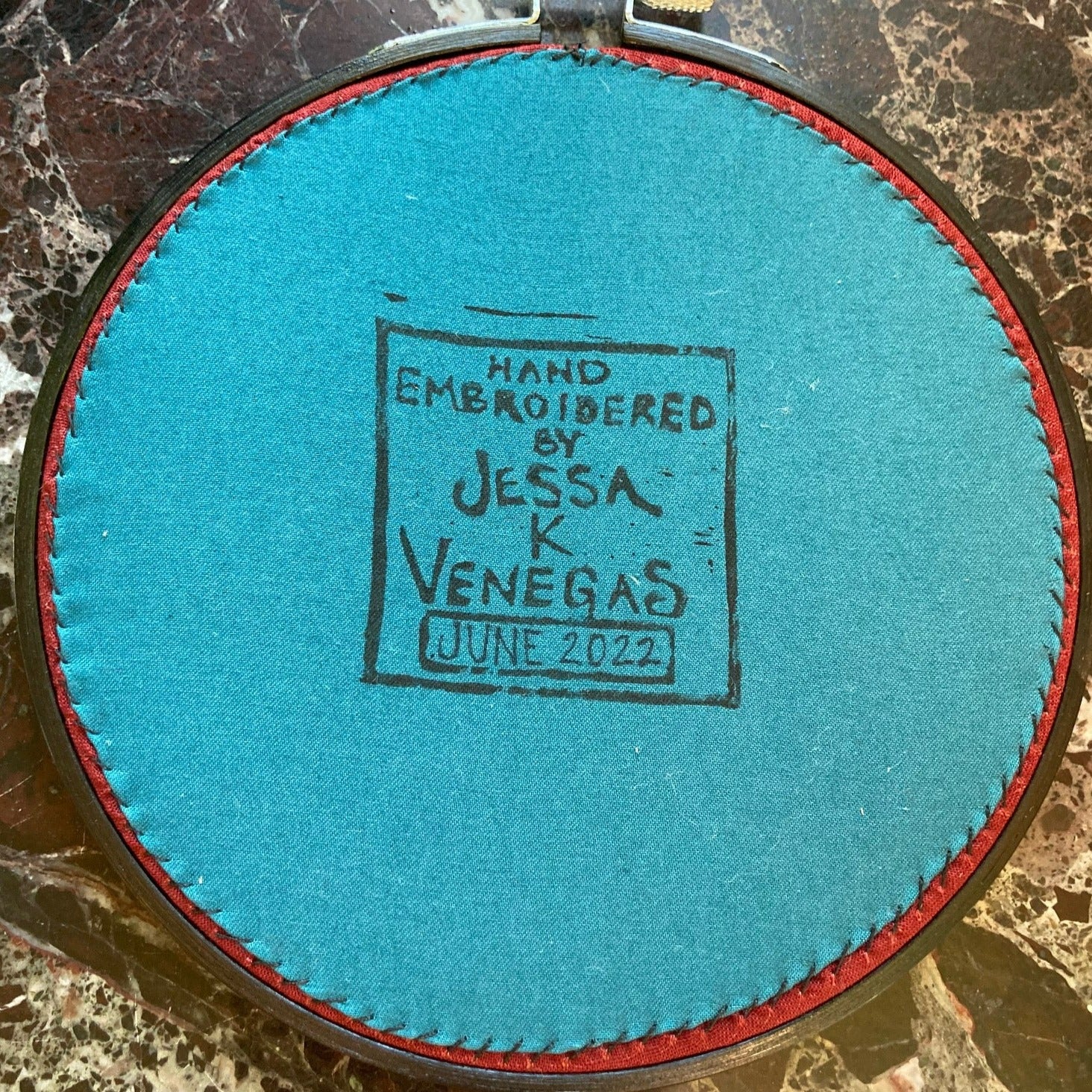 The hoop measures 5" round internally and is painted black. The artwork is all hand-stitched, and it's the only one of its kind.