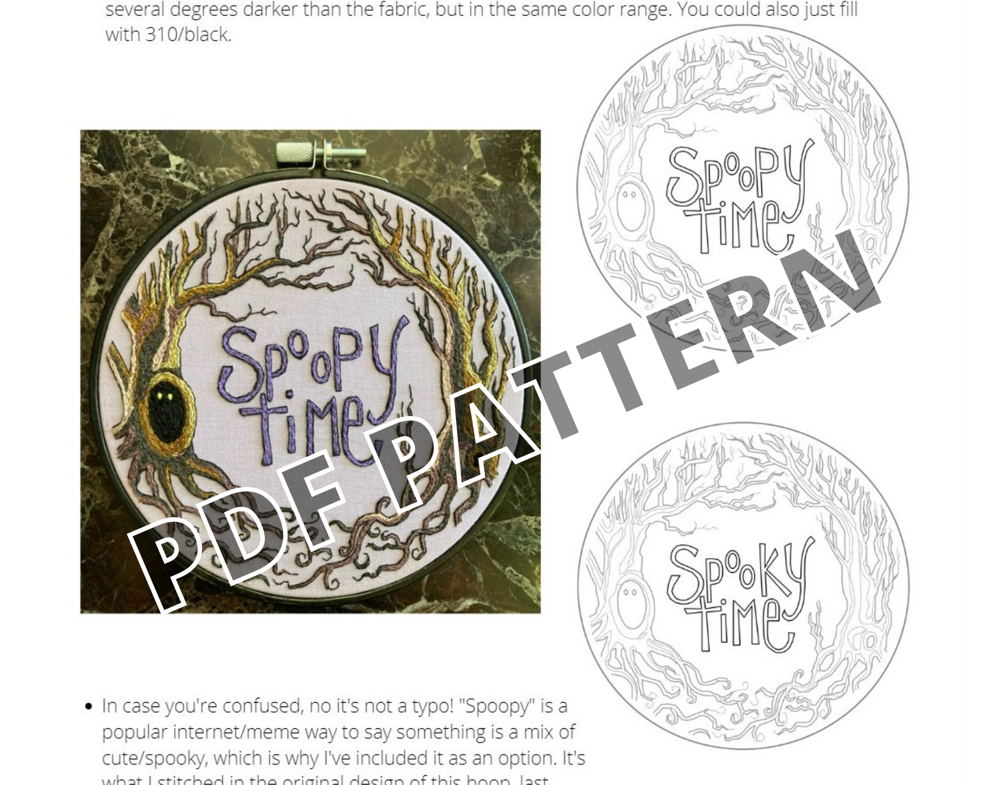 I designed this hand embroidery piece for Halloween in 2021, and finally got around to releasing the pattern in a downloadable format so you can stitch it yourself! The design is quite versatile, with options to leave the border on its own, or to add text to the space in the center (with included text pattern options for "SPOOKY TIME" and even "SPOOPY TIME" for the meme crowd).